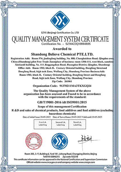 Shandong Believe Chemical Pte. Ltd. is located in Qingdao, the world’s beer city and sailing capital. Qingdao is an important coastal central city, a coastal open city, a new first tier city, an economic center, and a national historic and cultural city.